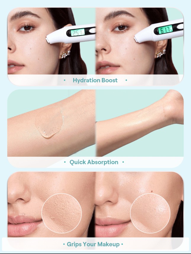 Hidratación prolongada: ingredientes como ácido hialurónico, péptidos y extracto de algas mantienen la piel fresca, con volumen y lista para fotos por hasta 24 hora.